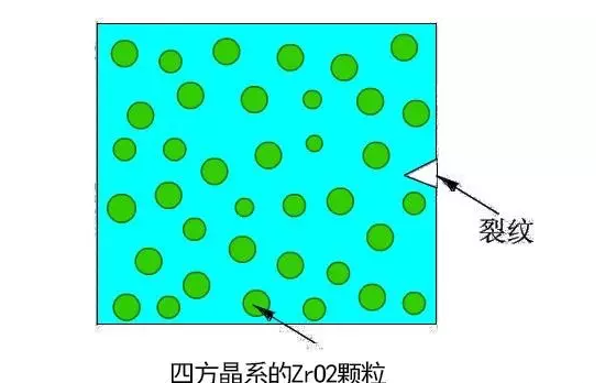 氧化鋯中四方相向單斜相的轉(zhuǎn)變可通過應(yīng)力誘發(fā)產(chǎn)生。當(dāng)材料受到外界拉應(yīng)力時(shí),基體對(duì)ZrO2的壓抑作用得到松弛,ZrO2顆粒即發(fā)生四方相到單斜相的轉(zhuǎn)變,這種相變將吸收能量而使裂紋尖端的應(yīng)力場(chǎng)松弛,增加裂紋擴(kuò)展阻力,從而大幅度提高陶瓷材料的韌性。