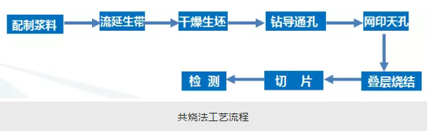 共燒法分為高溫共燒和低溫共燒。兩者工藝流程基本相同,首先將陶瓷粉體與有機粘接劑混合形成漿料,再利用刮刀把漿料加工成片狀,經(jīng)干燥后形成陶瓷生坯,然后根據(jù)設計要求在生坯上加工導通孔并填充金屬粉末,利用絲網(wǎng)印刷技術在生坯表面涂布形成線路圖形,最后將各層生坯層疊后進行壓合,在共燒爐內完成燒結并成型。具體如下: