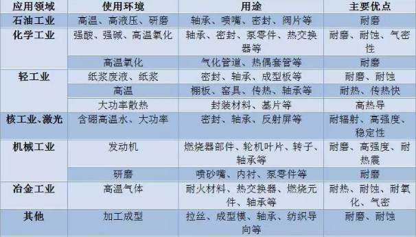 碳化硅以共價(jià)鍵為主,共價(jià)鍵約占88%。晶格的基本結(jié)構(gòu)是互相穿插的SiC4和CSi4四面體。SiC具有α和β2種晶型,當(dāng)溫度低于1600℃時(shí),SiC以β-SiC形式存在,當(dāng)高于1600℃時(shí),β-SiC轉(zhuǎn)變?yōu)?amp;alpha;-SiC形式。碳化硅陶瓷在現(xiàn)代的工業(yè)中碳化硅起著不可或缺的作用。表1詳細(xì)地列出了其用途。