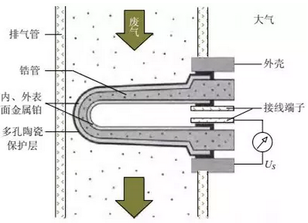 發(fā)動(dòng)機(jī)排出的廢氣從氧傳感器的端部經(jīng)過并與鋯管的外表面接觸,空氣從傳感器尾部的通氣孔進(jìn)入鋯管的內(nèi)表面。在溫度超過300℃時(shí)氧發(fā)生電離,根據(jù)ZrO2的測(cè)氧原理,由于大氣中的氧氣比廢氣中的氧氣多,因而氧離子從大氣側(cè)向廢氣側(cè)擴(kuò)散,兩側(cè)離子的濃度差產(chǎn)生電動(dòng)勢(shì),此時(shí)鋯管相當(dāng)于一個(gè)微電池,向外輸出電壓信號(hào)。鋯管內(nèi)外表面氧濃度差越大,輸出電壓信號(hào)也越高。
