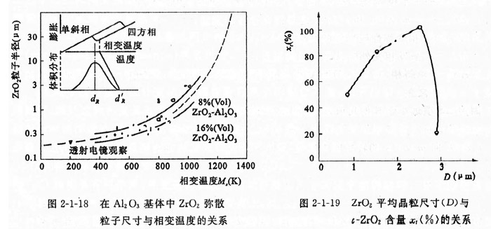 氧化鋯的顆粒尺寸,對相變增韌是有影響的。實踐表明,氧化鋯相變的條件應(yīng)是單位體積的氧化鋯顆粒數(shù)的總能量相當(dāng)于氧化鋯相變引起的界面能變化。氧化鋯在陶瓷基體中的相變溫度是氧化鋯顆粒尺寸和化學(xué)組分的函數(shù),圖2-1-18表明了1696 (VoI) 氧化鋯-A1209和8~6( V01)氧化鋯 -Alz 03系統(tǒng)中的氧化鋯相變溫度與其顆粒度之間的關(guān)系。由此看出,在冷卻過程中顆粒大者優(yōu)先由四方相轉(zhuǎn)變?yōu)閱涡毕唷<囱趸啅浬⒂谔沾苫w中的相變溫度M.是隨著氧化鋯顆粒的減小而偏低的。當(dāng)氧化鋯顆粒小到足以使相變溫度偏移到常溫下,即t-氧化鋯 -直保持到常溫,則陶瓷基體中就儲存了相變彈性壓應(yīng)變能(,-丁),只有當(dāng)基體受到了適量的外加張應(yīng)力,其對氧化鋯的束縛得以解除,才能發(fā)生四方相氧化鋯向單斜相氧化鋯轉(zhuǎn)化。如果氧化鋯顆粒尺寸較大,則其相變溫度處于常溫以上,那么制品冷卻至室溫之前,t-氧化鋯就已自發(fā)地轉(zhuǎn)化為m-氧化鋯。而且氧化鋯品粒尺寸對t-氧化鋯含量的影響也是很重要的。如圖2-1-19所示。從圖中看出,最高的t-氧化鋯的含量只處于很窄的晶粒尺寸范圍內(nèi)。